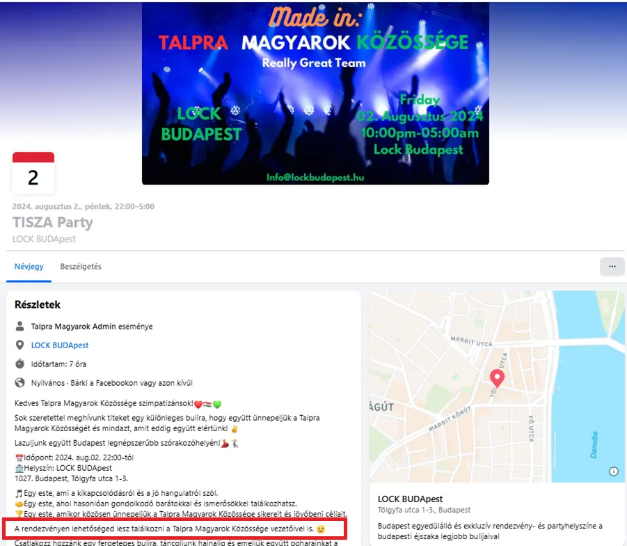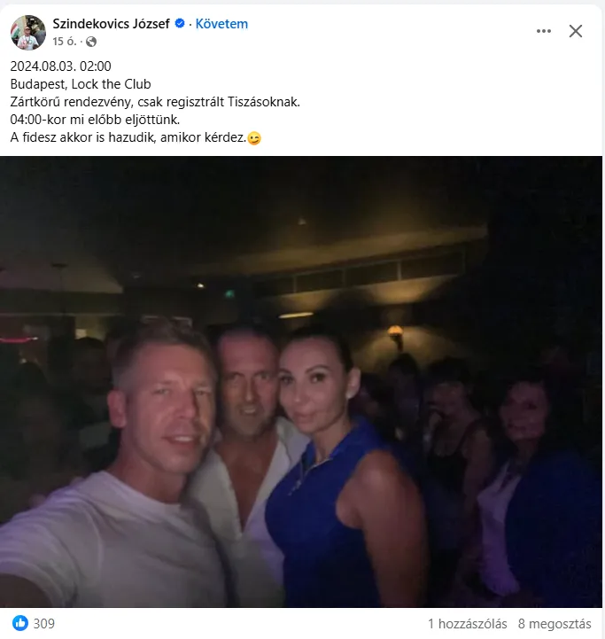 Az Ellenpont beszámolója szerint több, eddig nem publikált fotó és videó került a birtokukba a Tisza Párt 2024. augusztus 2-ról 3-ra virradó éjszakán tartott rendezvényéről. A lap emlékeztet: a pártelnök és alelnöke, Radnai Márk is részt vett a Buda egyik elit szórakozóhelyén, a Lock the Clubban szervezett eseményen, ahonnan Magyar Péter saját elmondása szerint egy belvárosi lakásba ment tovább.