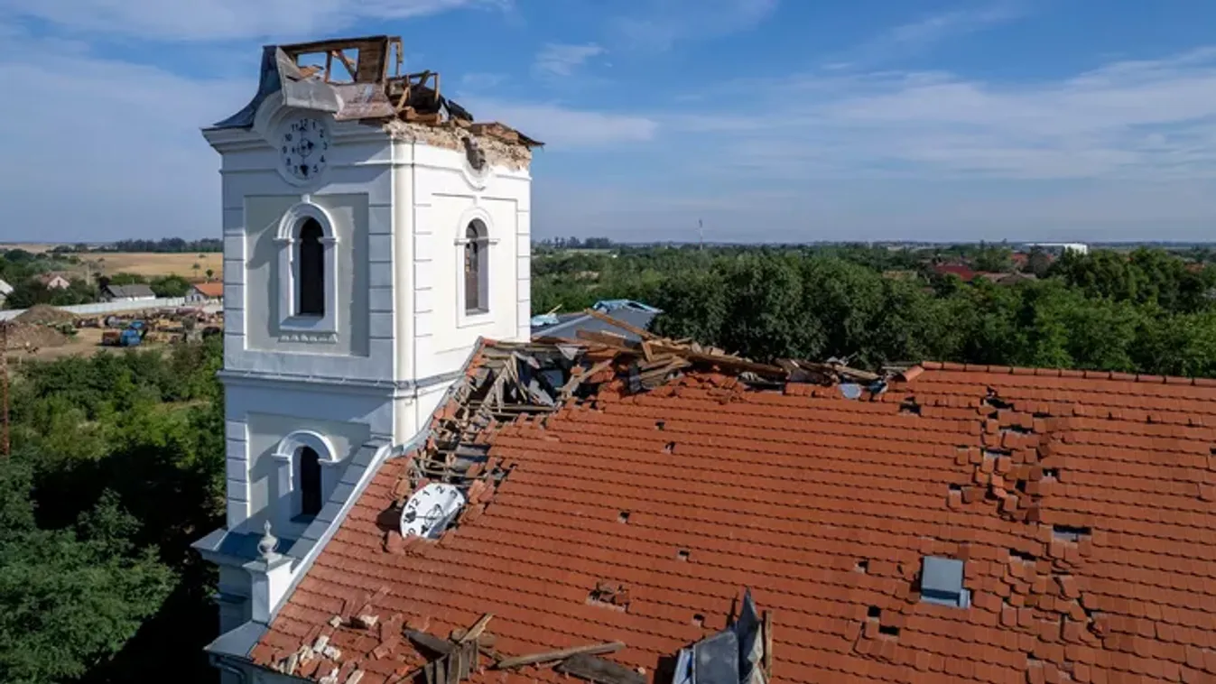 A ledőlő torony egyik része beszakította a templom tetejét.