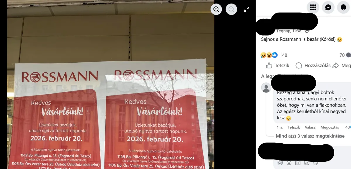A bejegyzésben látható kép a Rossmann tájékoztatása a boltbezárásról. Ennek alapján az üzlet utolsó nyitvatartási napja 2026. február 20.