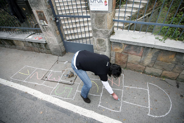 Deutsch Tamás ugróiskolát rajzol az MTVA bejárata előtt
