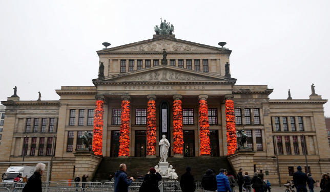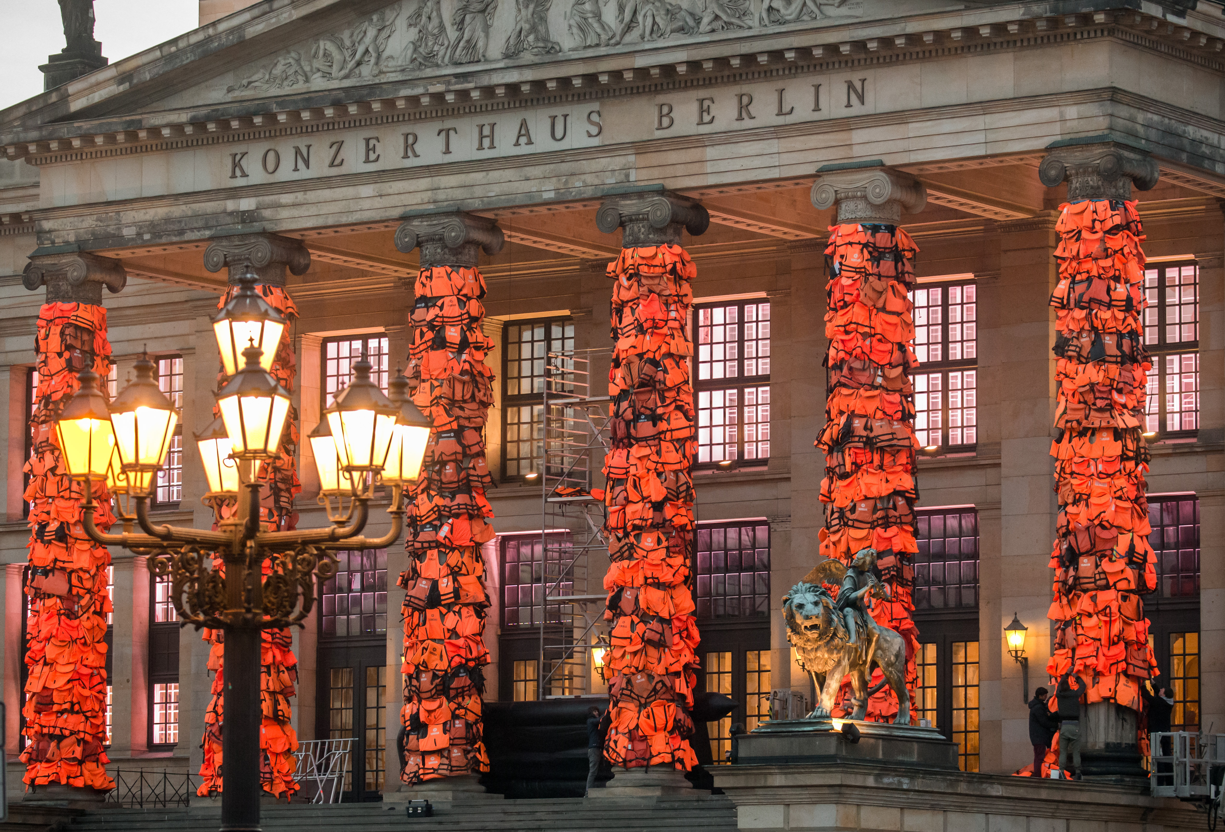 A kínai művész és társadalmi aktivista, Aj Vej-vej legújabb installációja Berlinben látható: 14 ezer használt mentőmellénnyel borította be a Konzerthaus oszlopait.