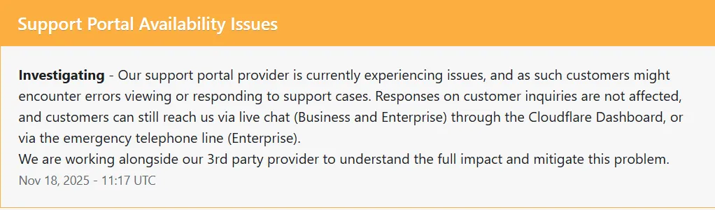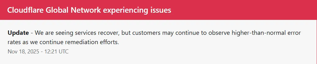 A rendszerstátusz-jelentések szerint jelenleg olyan szerver hiba bénítja meg a működést, amely a Cloudflare globális hálózatát érinti, és világszintű szolgáltatáskiesést váltott ki. A problémák hirtelen jelentkeztek 500-as hibákkal, majd a Cloudflare dashboard és több API végpont is elérhetetlenné vált. A szolgáltató közölte, hogy vizsgálják a hiba okát és dolgoznak a stabilizáláson.