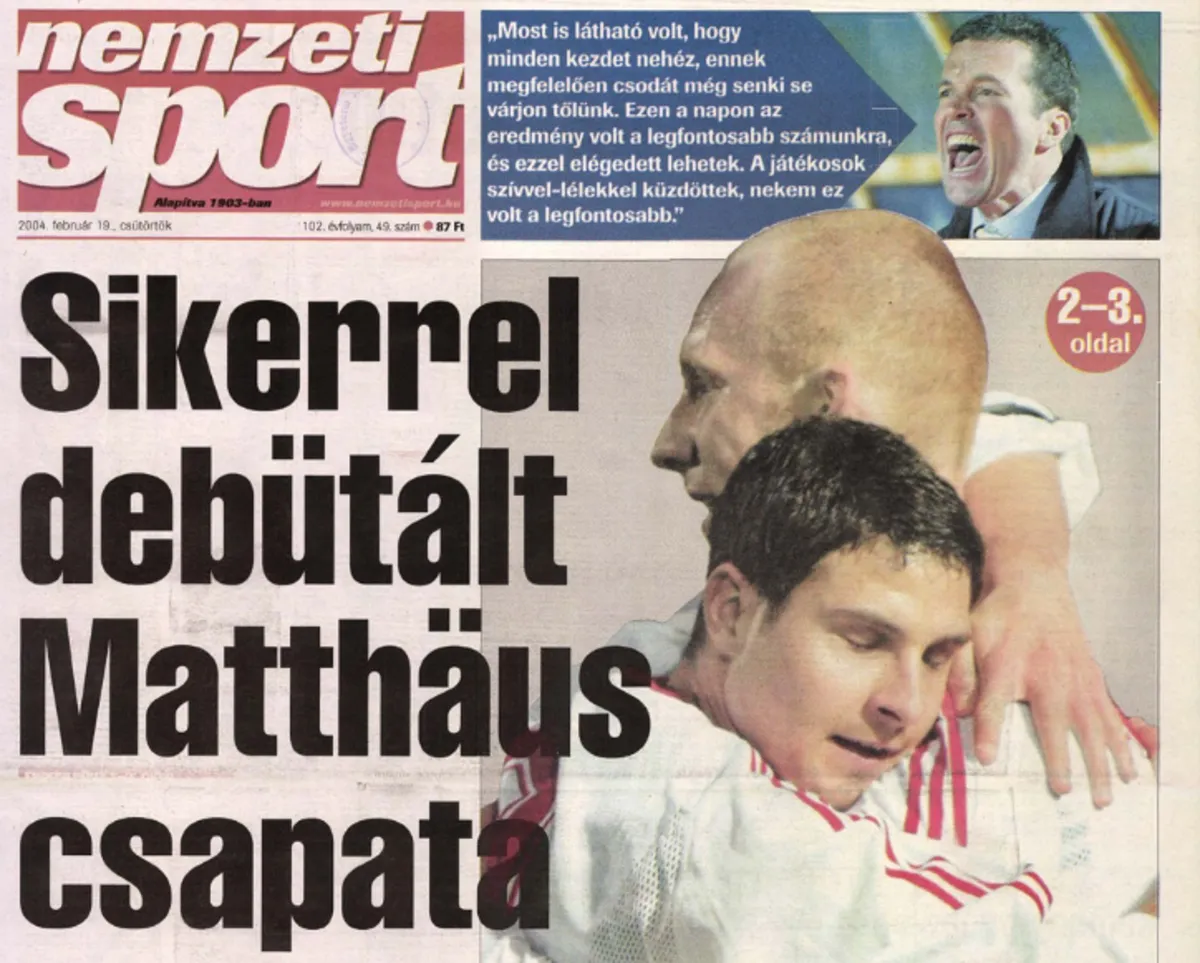 A Nemzeti Sport azt írta a 21 évvel ezelőtti tudósításában, hogy a reménykedés hangjai és a gyász csendje vezette fel Lothar Matthäus bemutatkozását. Az első félidőben a magyar válogatott nem futballozott fölényben, azonban így is szerezhetett volna három gólt, hiszen Kovács Péternek volt ígéretes fejese, míg Szabics Imre elhibázott egy kihagyhatatlannak tűnő ziccert. A elpuskázott helyzetek majdnem megbosszulták magukat, de Babos Gábor szerencsére szenzációsan védett, így a mieink legalább nem kerültek hátrányba, ha már a vezetést nem tudták megszerezni. A félidőben is nyugodtnak tűnt Matthäus, az öltözőben pedig bevezetésként csak annyit mondott a játékosainak: