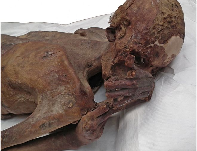 A férfi múmiát száz évvel ezelőtt találták meg. Korábbi CT-vizsgálatok alapján 18-21 éves lehetett, amikor a hátát ért szúrt seb a halálát okozta.