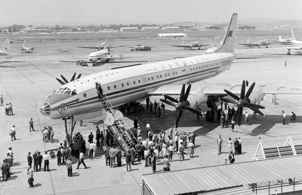 Az 1955-ös genfi csúcsra az amerikai Eisenhower elnök hatalmas, négymotoros repülőgéppel érkezett, míg a szovjet pártfőtitkár szégyenszemre egy kétmotoros Il-14-es géppel landolt. Hruscsovot ez annyira feldühítette, hogy kiadta a parancsot egy új, óriási szovjet repülőgép megtervezésére. A Tupoljev tervezőiroda ehhez elővette a már elkészült Tu-95 stratégiai bombázó terveit, és megkezdte a gép átalakítását. A polgári változat a Tu-114 nevet kapta.
