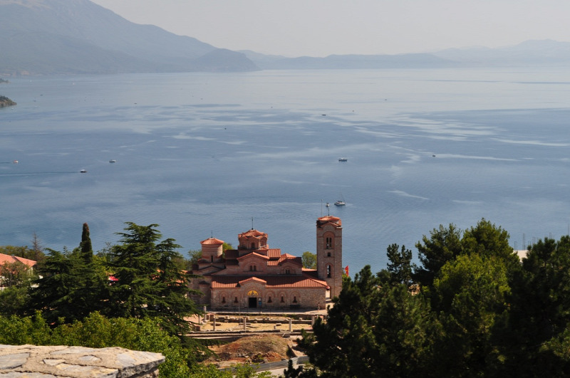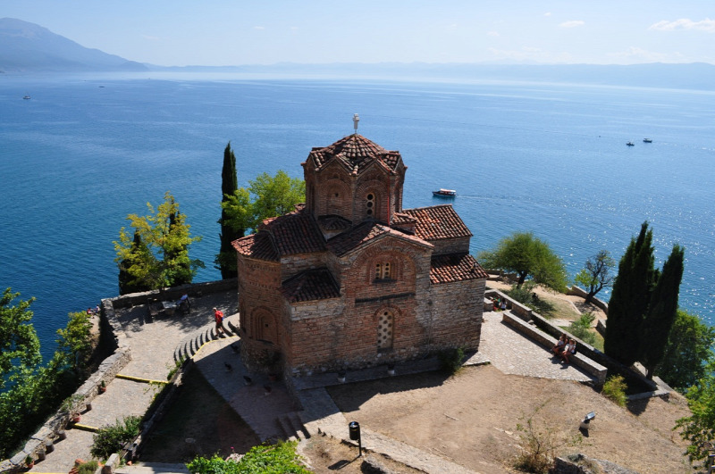 A város és a tó legfőbb ékköve, szimbóluma a kaneói Szent Jovan-templom, amelynek sziluettje a víztükör fölé magasodik. A európai filmművészet rajongói biztosan felismerik az épületet, mivel többször feltűnik az egyik legismertebb macedón filmben, az Eső előtt című alkotásban, amely 1994-ben a macedón–albán etnikai konfliktusok meggyőző ábrázolásával nyert Arany Oroszlán-díjat a Velencei Filmfesztiválon. Nem kevésbé látványos a Szent Pantelejmon-monostor sem, amely szintén a tóval néz farkasszemet.