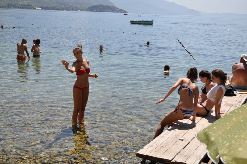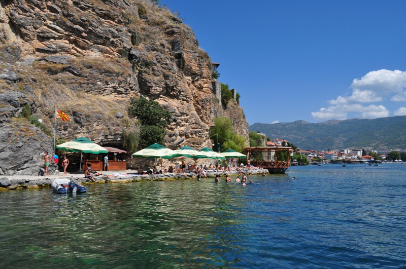 Az ohridi strandok úgy néznek ki, hogy a városnak szilárd talapzatot biztosító sziklák lábánál kanyarog egy pallókból és cölöpökből összeeszkábált ösvény, amely több kis öblöcskét fűz láncszerűen össze. Ezek az öblök jelentik a strandokat, ahol vízen lebegő stégeken lehet heverészni a nyugágyakon. Minden öbölhöz tartozik egy kis csehó, ahonnan dübörög a Bulgáriából importált, vérpezsdítő csalgamuzsika.